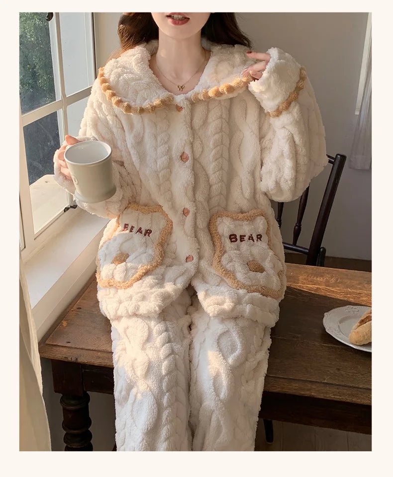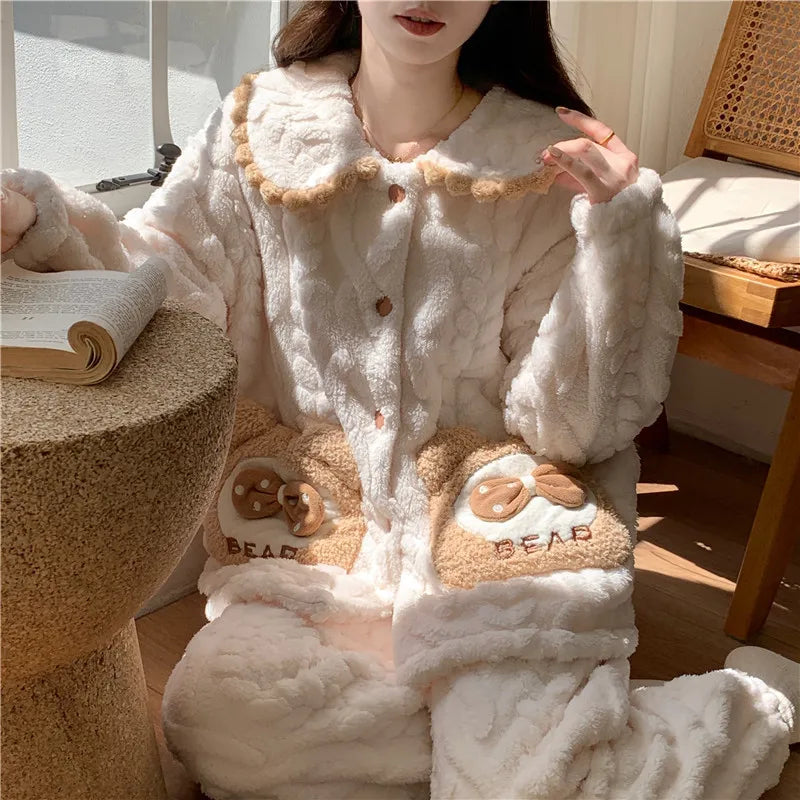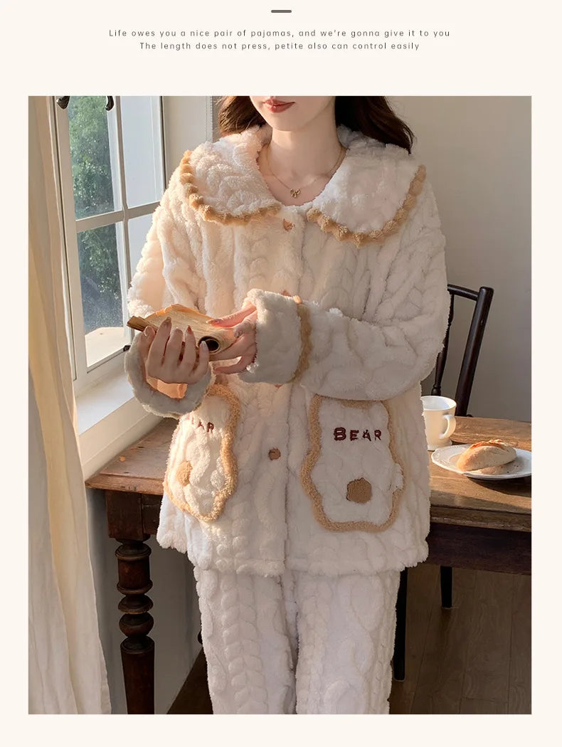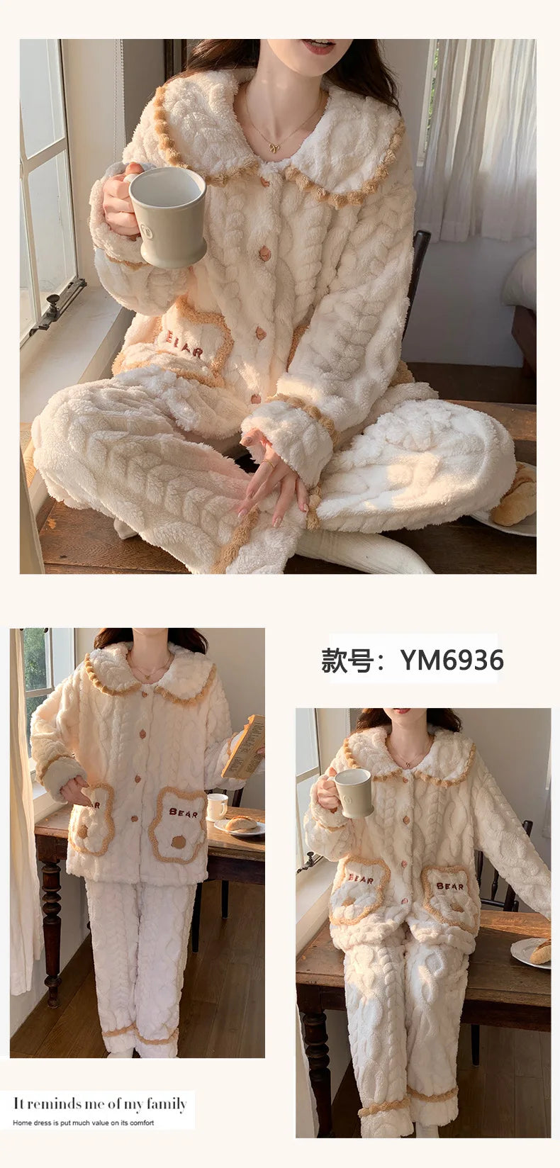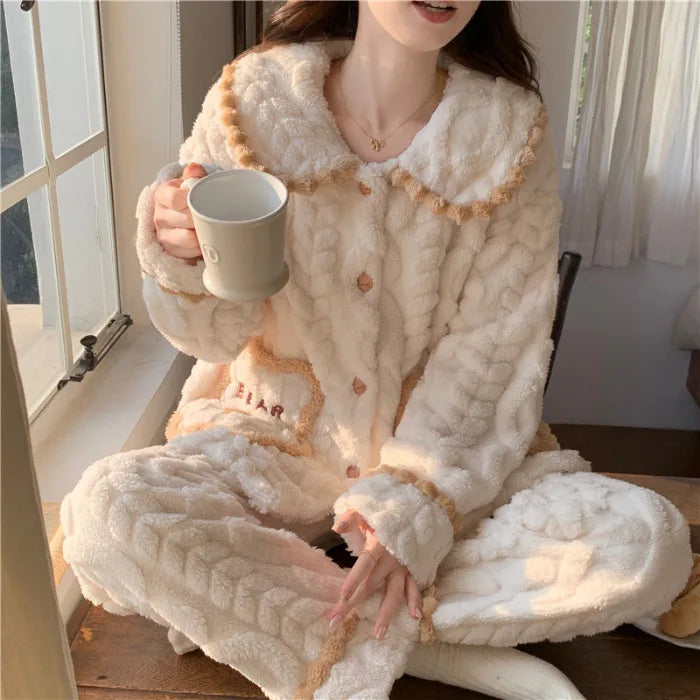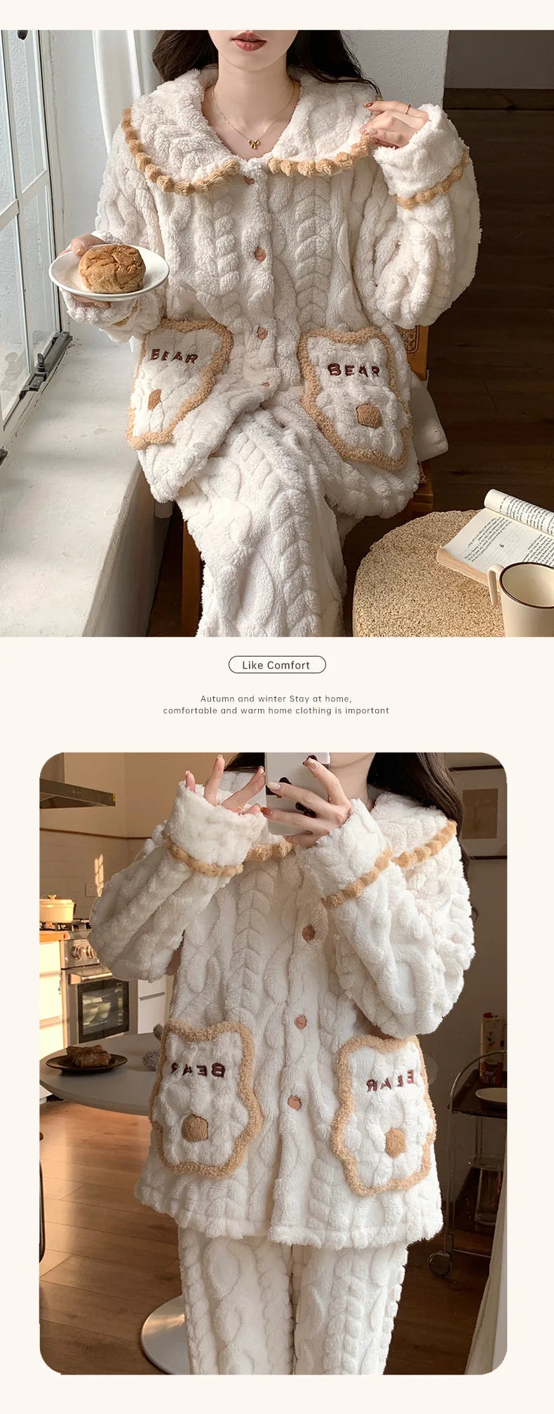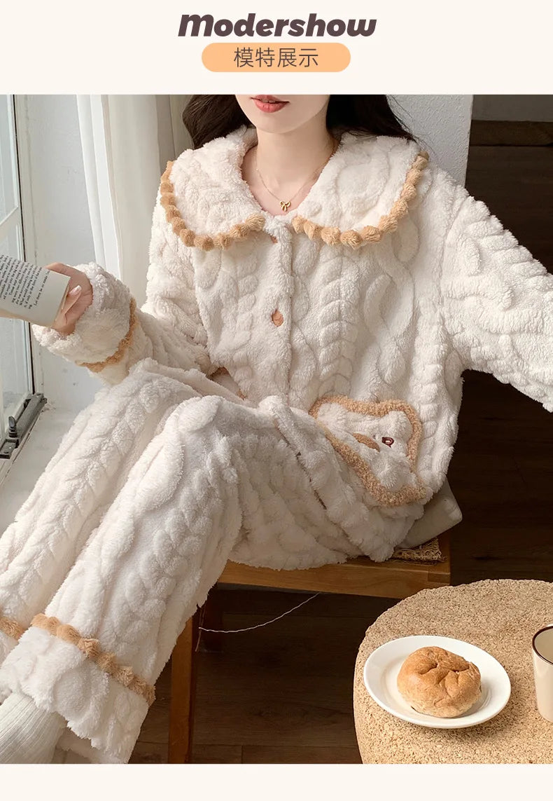 Conjunto de pijama de lana Coral para mujer, ropa de dormir cálida con forro polar para invierno, ropa de descanso de franela acogedora, traje para estar en casa, ropa de dormir cómoda
