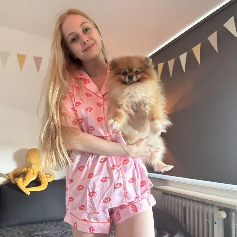 Disfruta de la comodidad y el estilo con este conjunto de pijama de satén con estampado de labios para mujer.... Read more