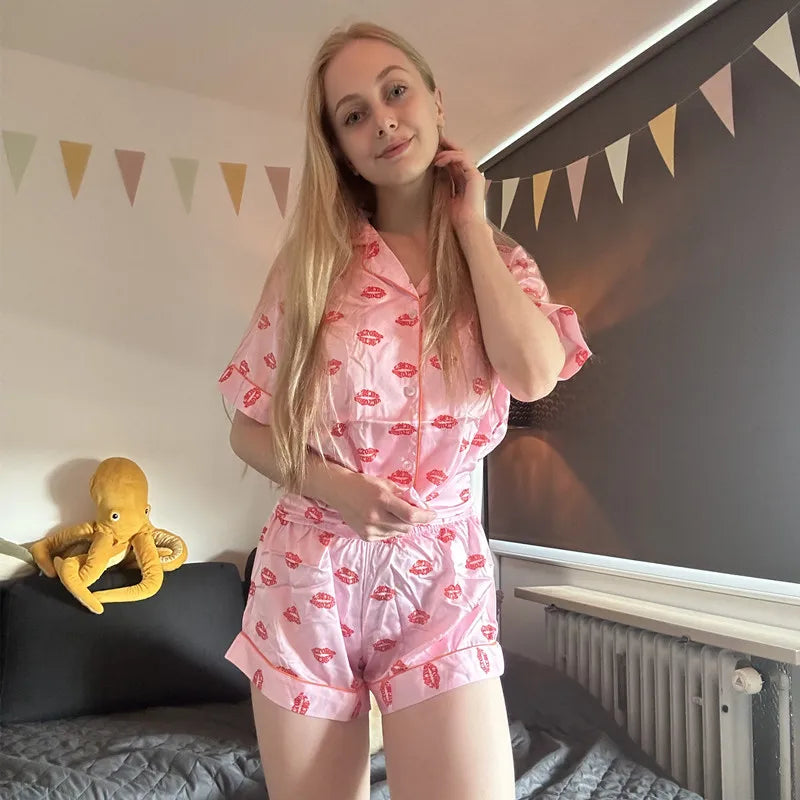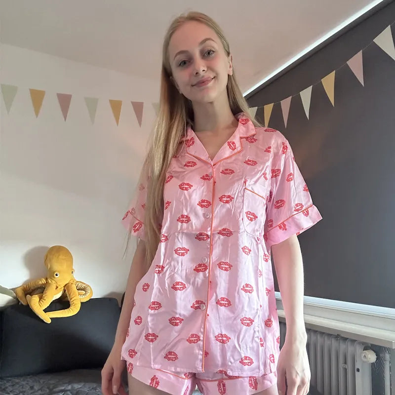 Conjunto de pijama de satén con estampado de labios para mujer, ropa de dormir suave de 2 piezas, Top de manga corta con pantalones cortos, ropa de salón rosa ligera para