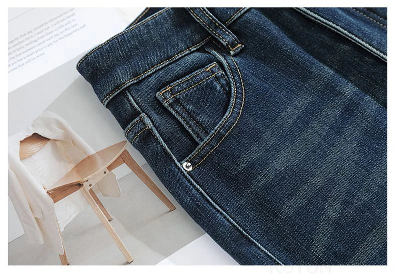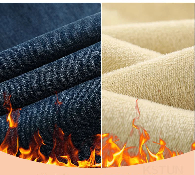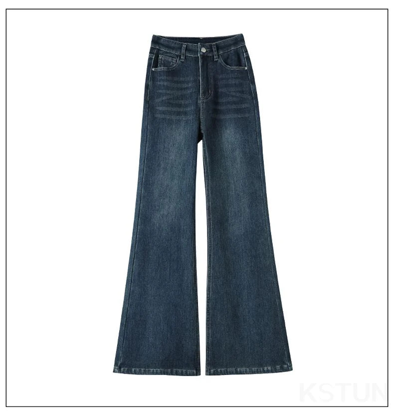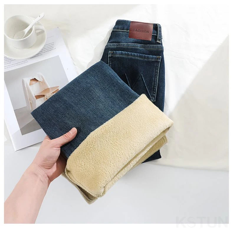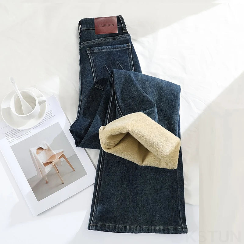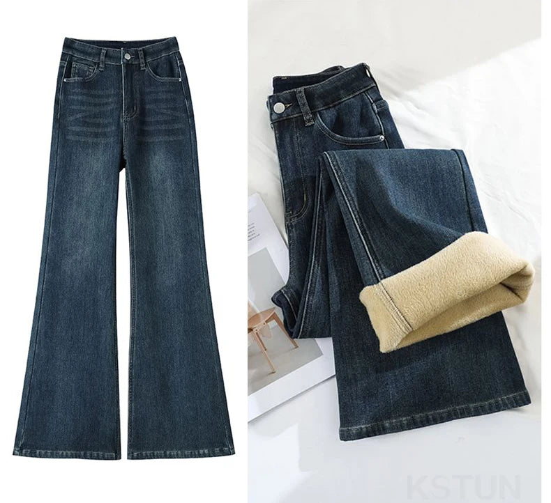 KSTUN 2025, pantalones vaqueros elásticos de lana de cintura alta Vintage para mujer, pantalones con parte inferior acampanada, pantalones vaqueros gruesos y cálidos, pantalones acampanados ajustados para mujer