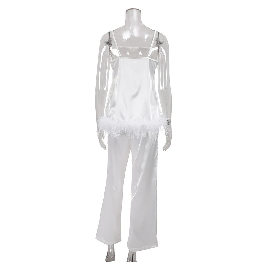Pijamas de satén con plumas para mujer, conjuntos de ropa de dormir con pantalones, traje para casa con tirantes finos negros, trajes de pantalón blanco 2022