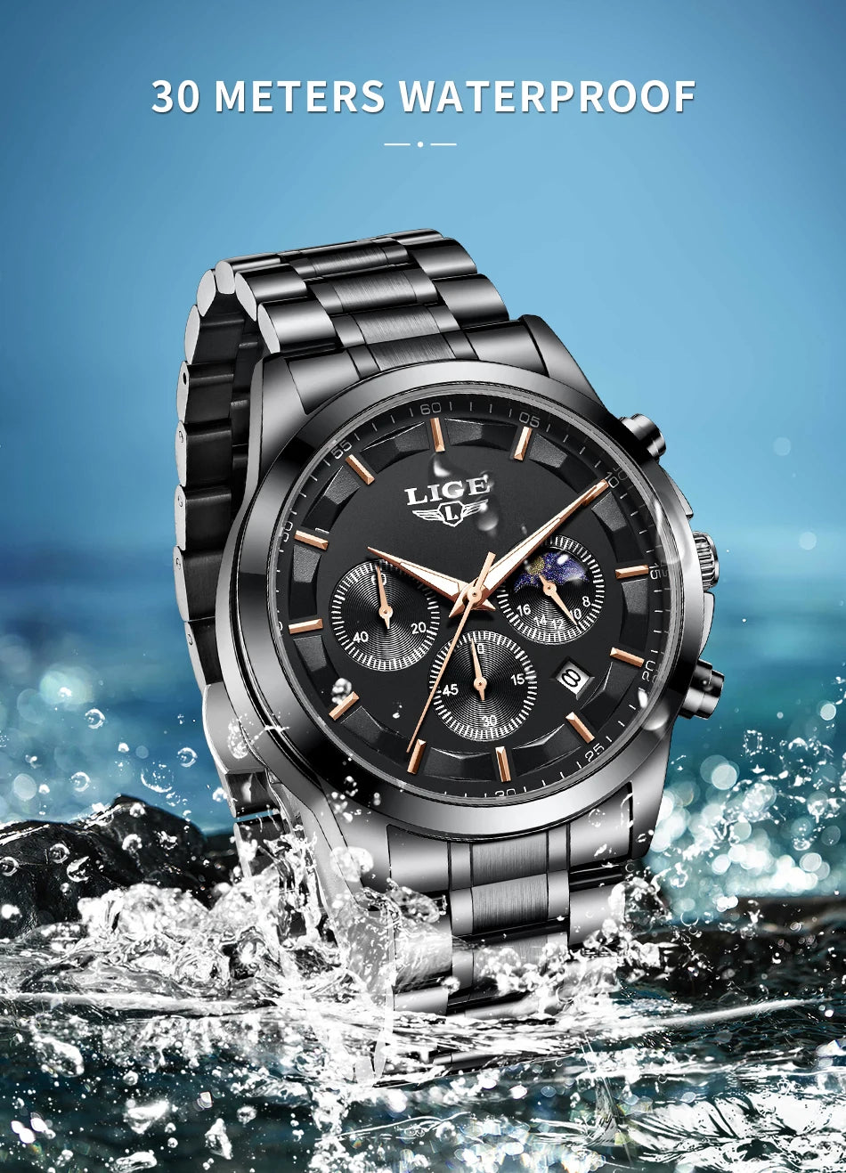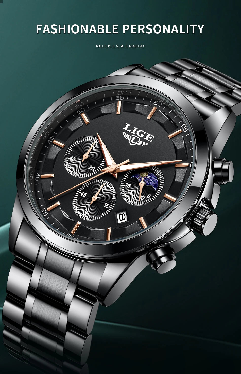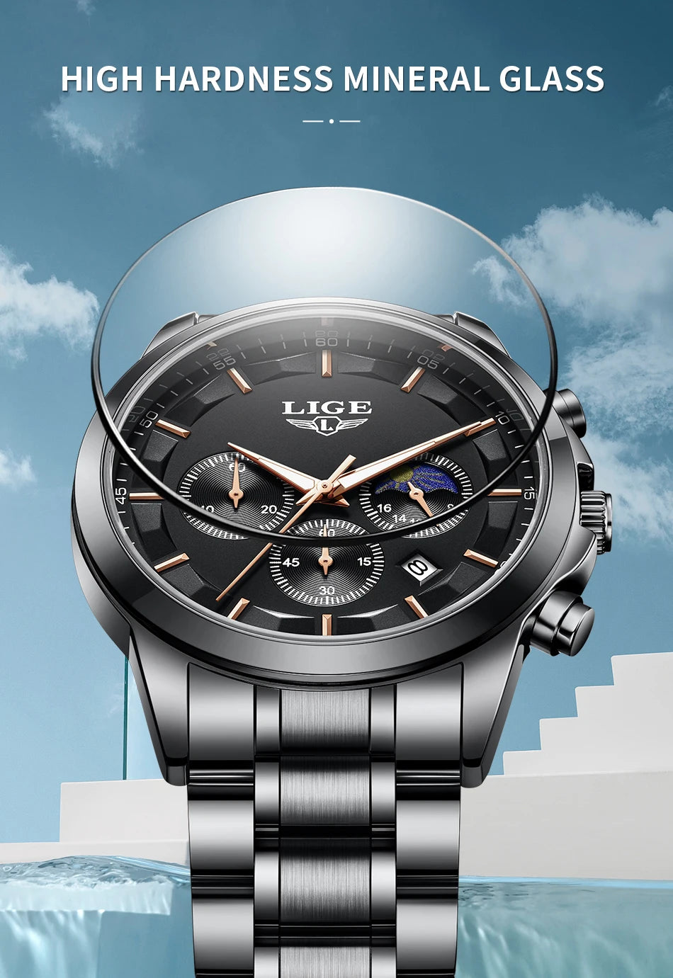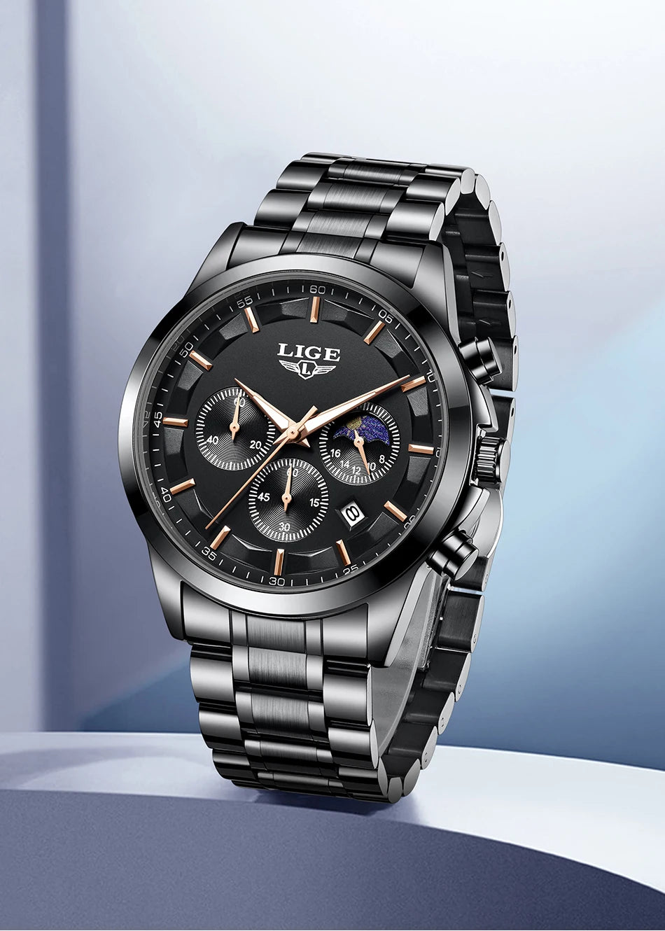 Reloj de Cuarzo LIGE para Hombre – Lujo Clásico con Fase Lunar y Fecha Automática