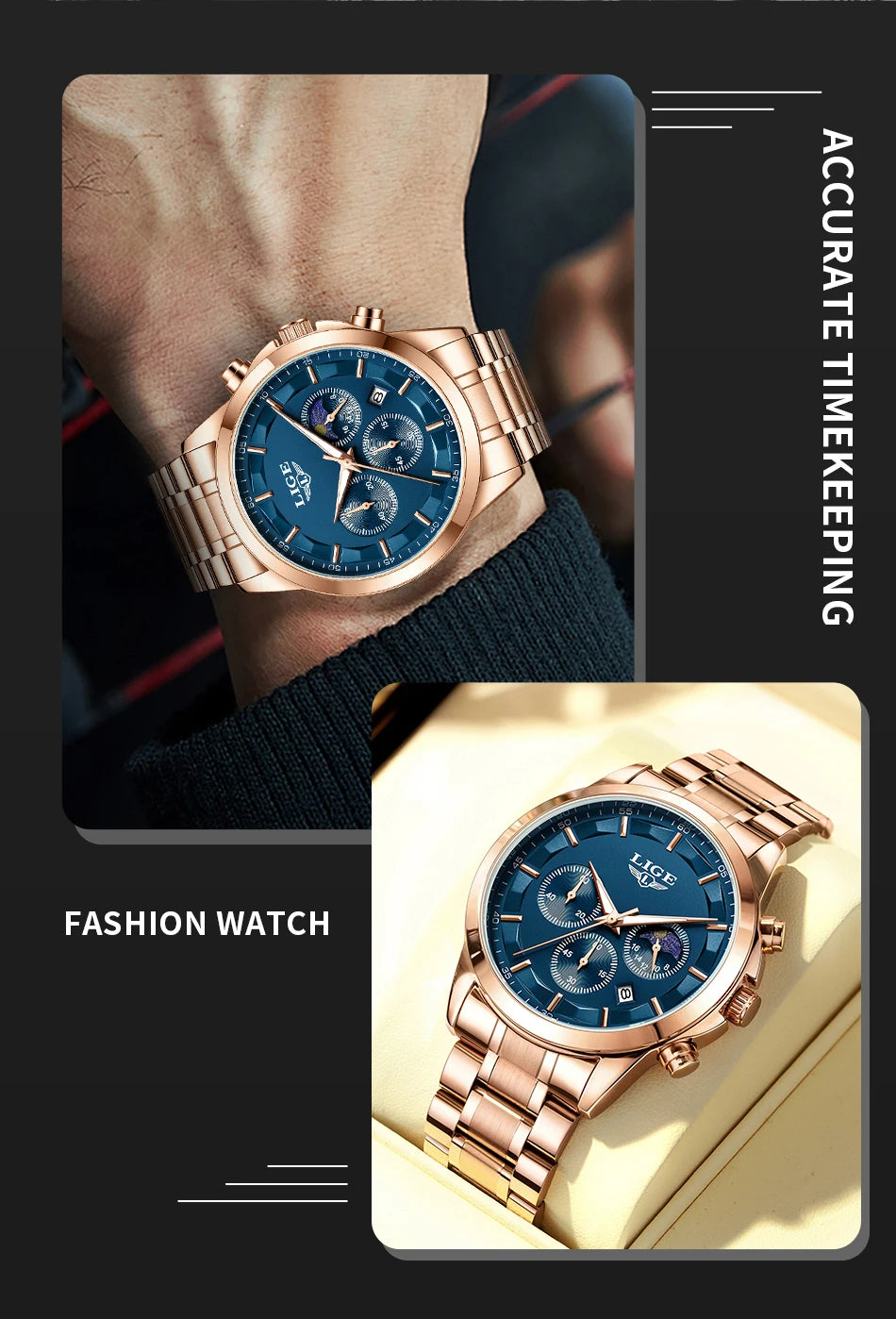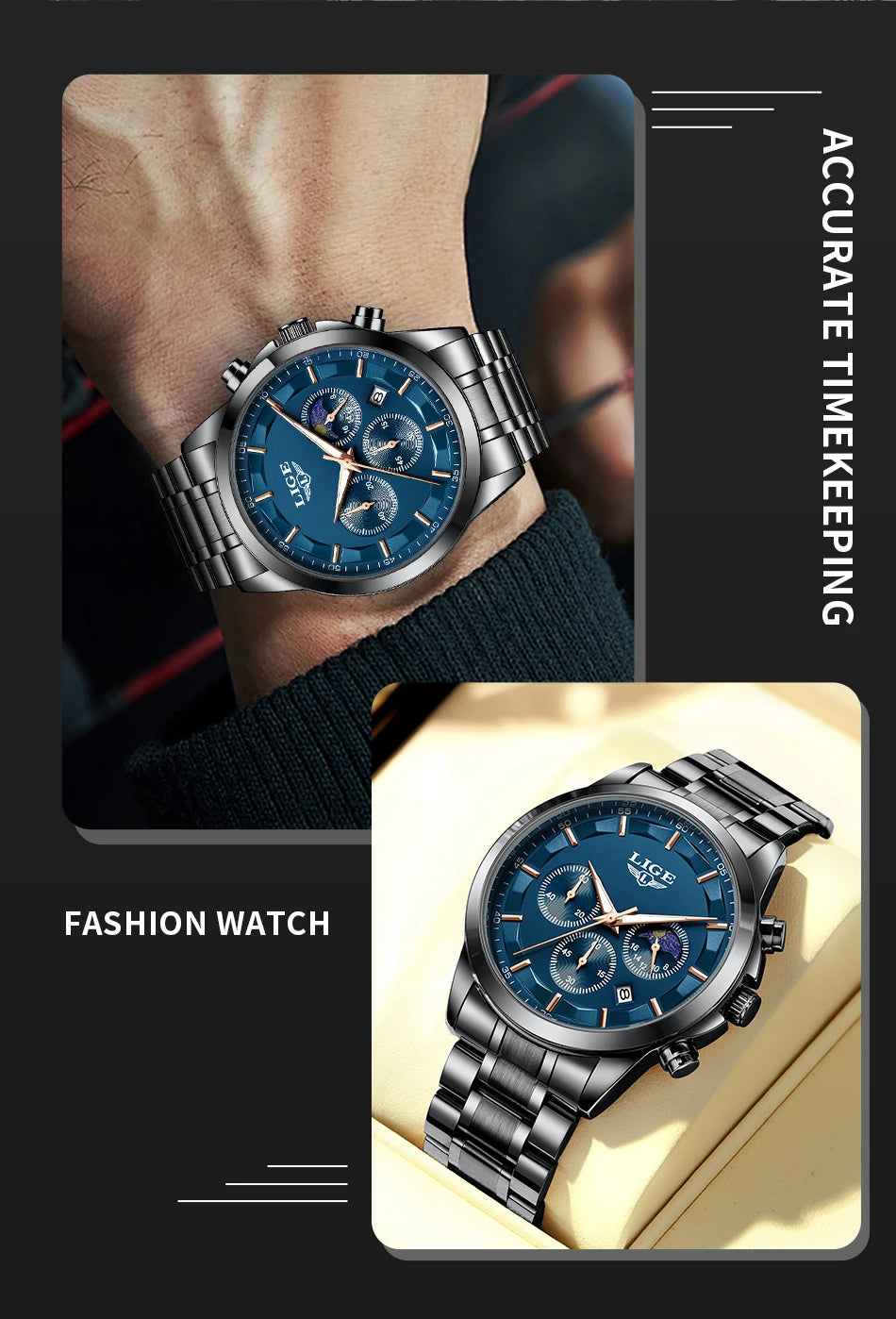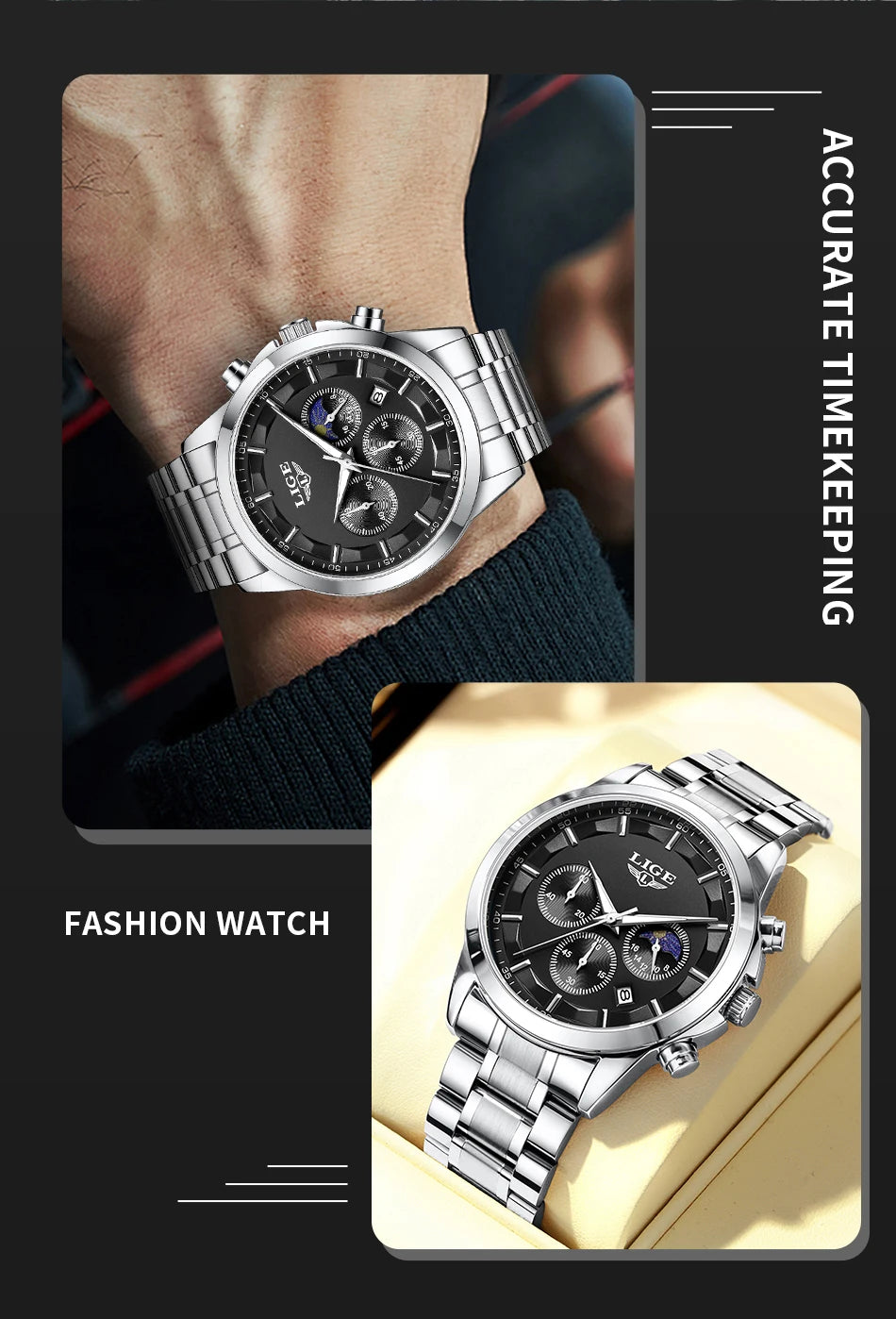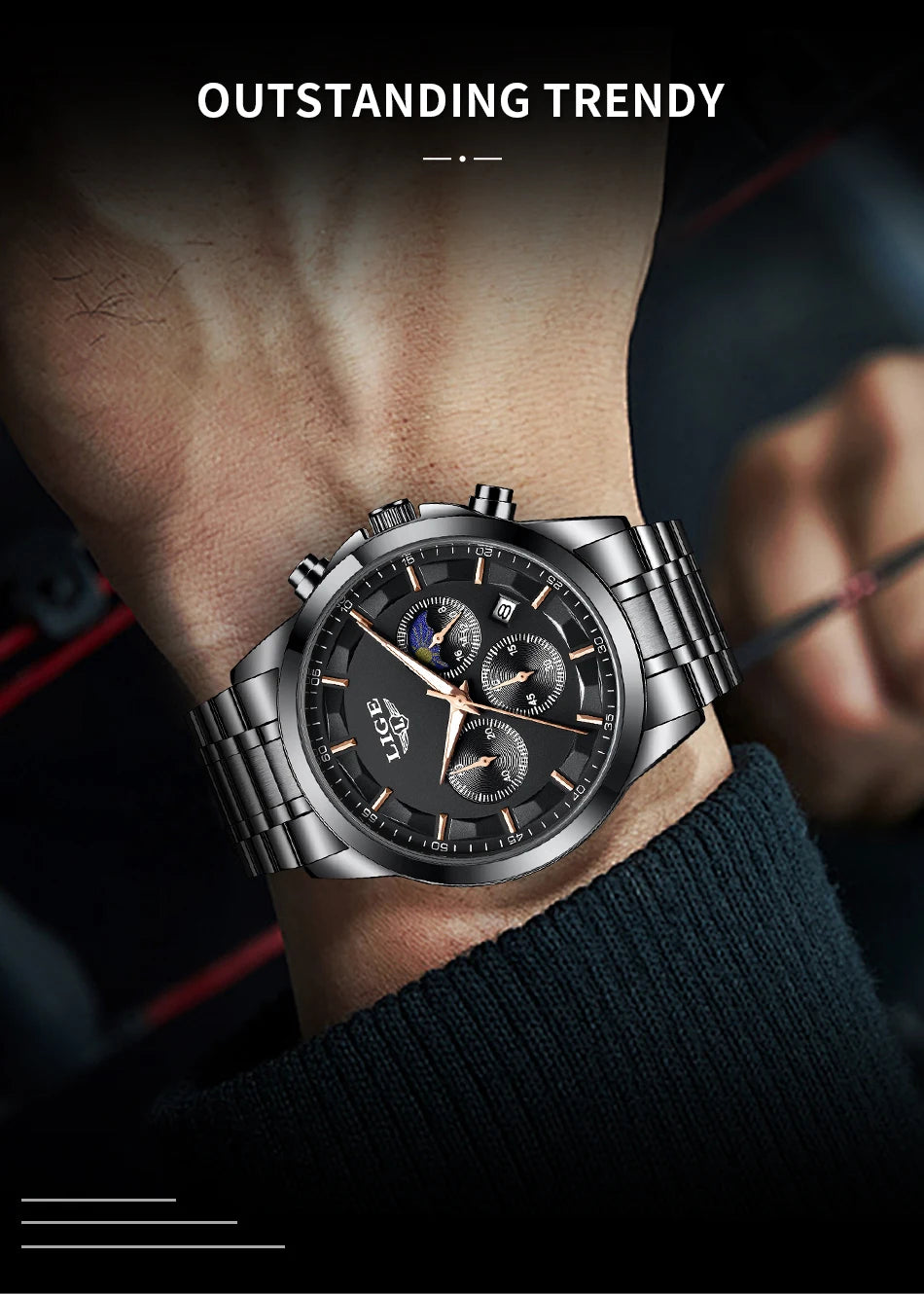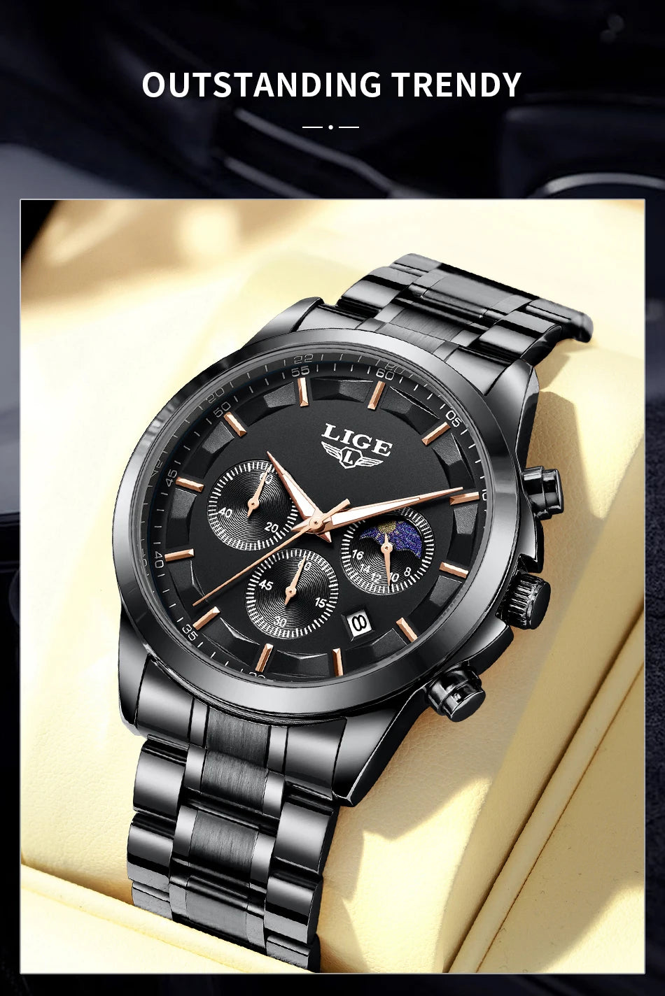 Reloj de Cuarzo LIGE para Hombre – Lujo Clásico con Fase Lunar y Fecha Automática