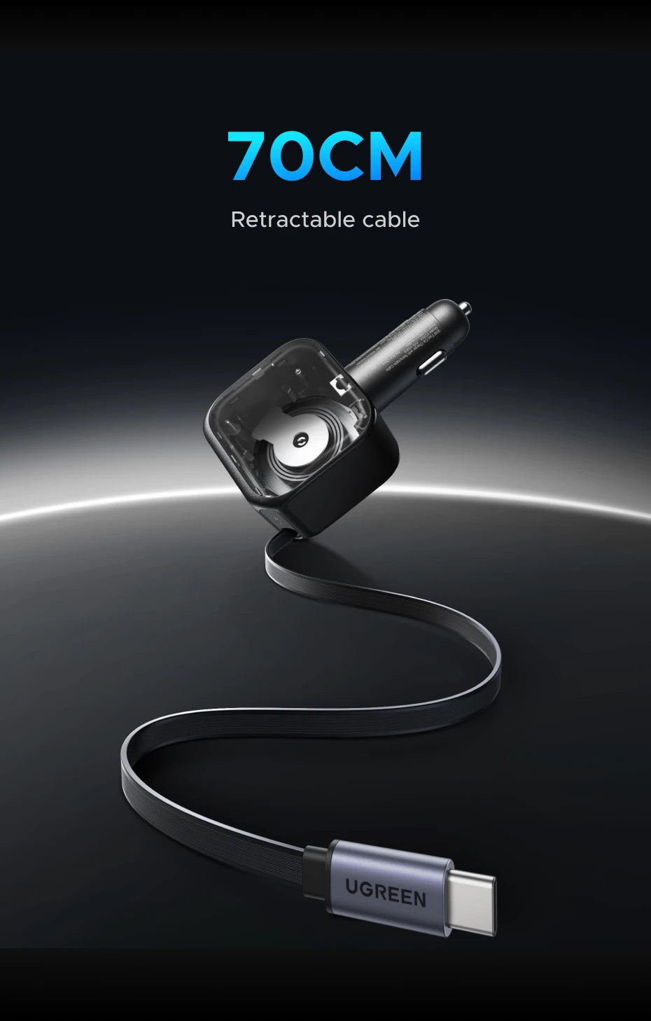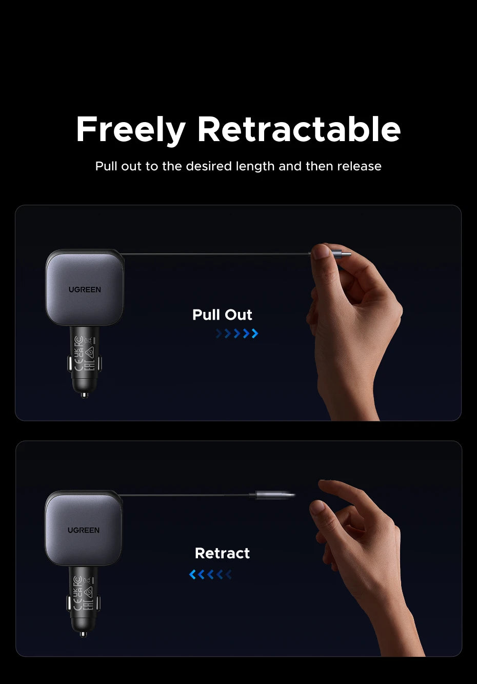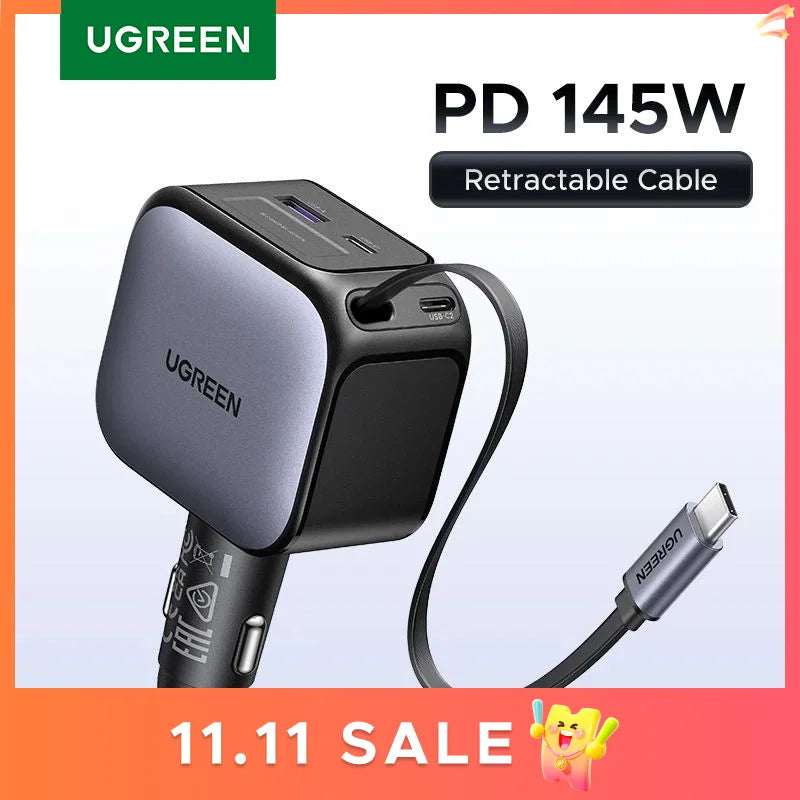 UGREEN 145W 90W 60W Cargador de coche 3 USB-C y 1 puertos USB-A PD QC4.0 Carga rápida con cable retráctil para iPhone 17 Pro MacBook