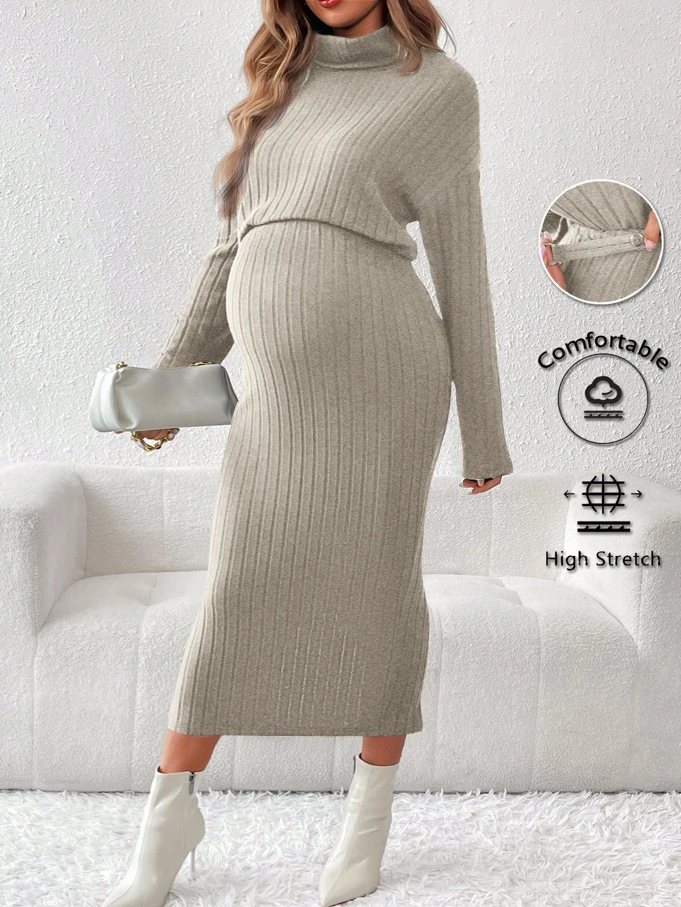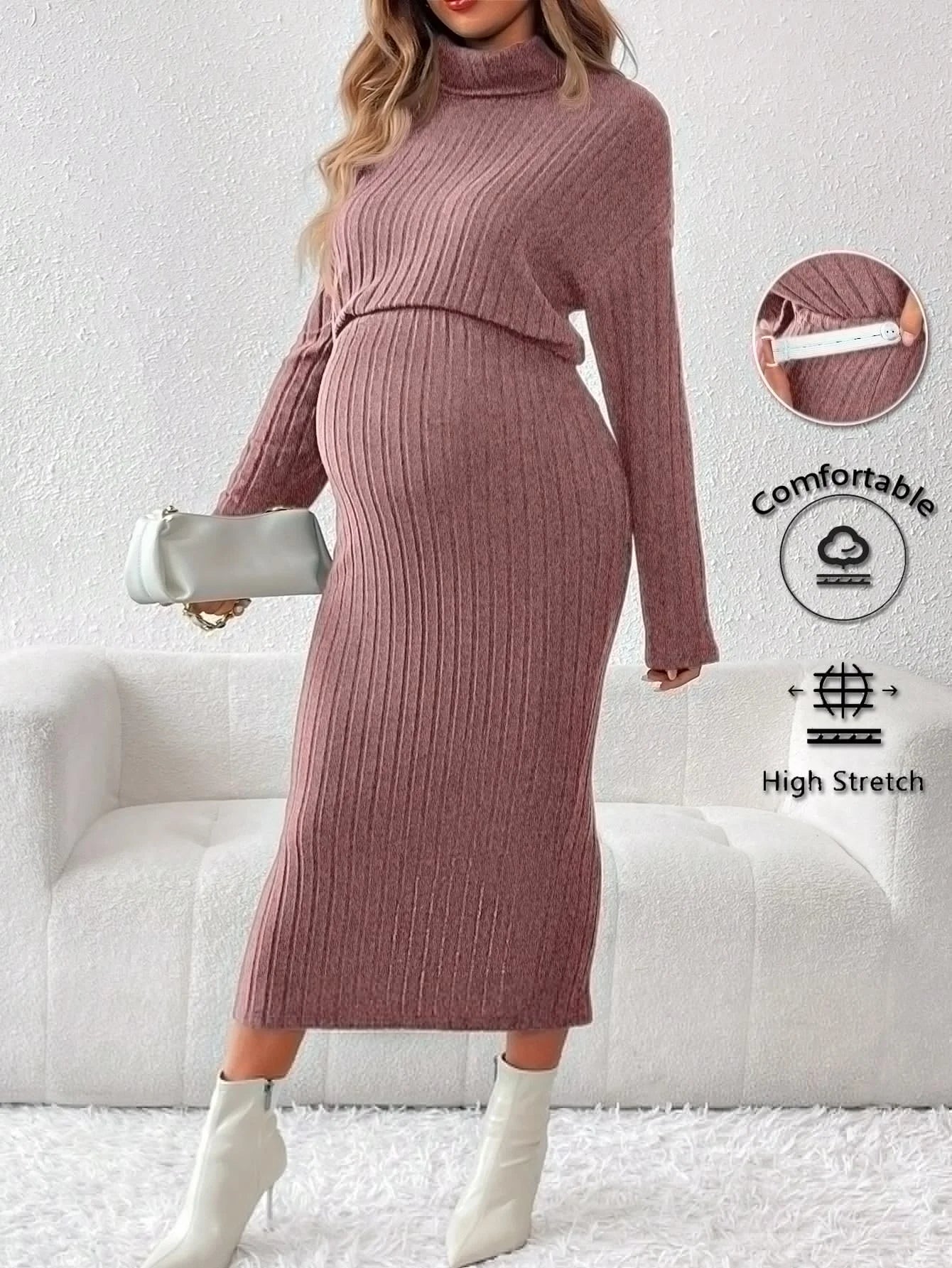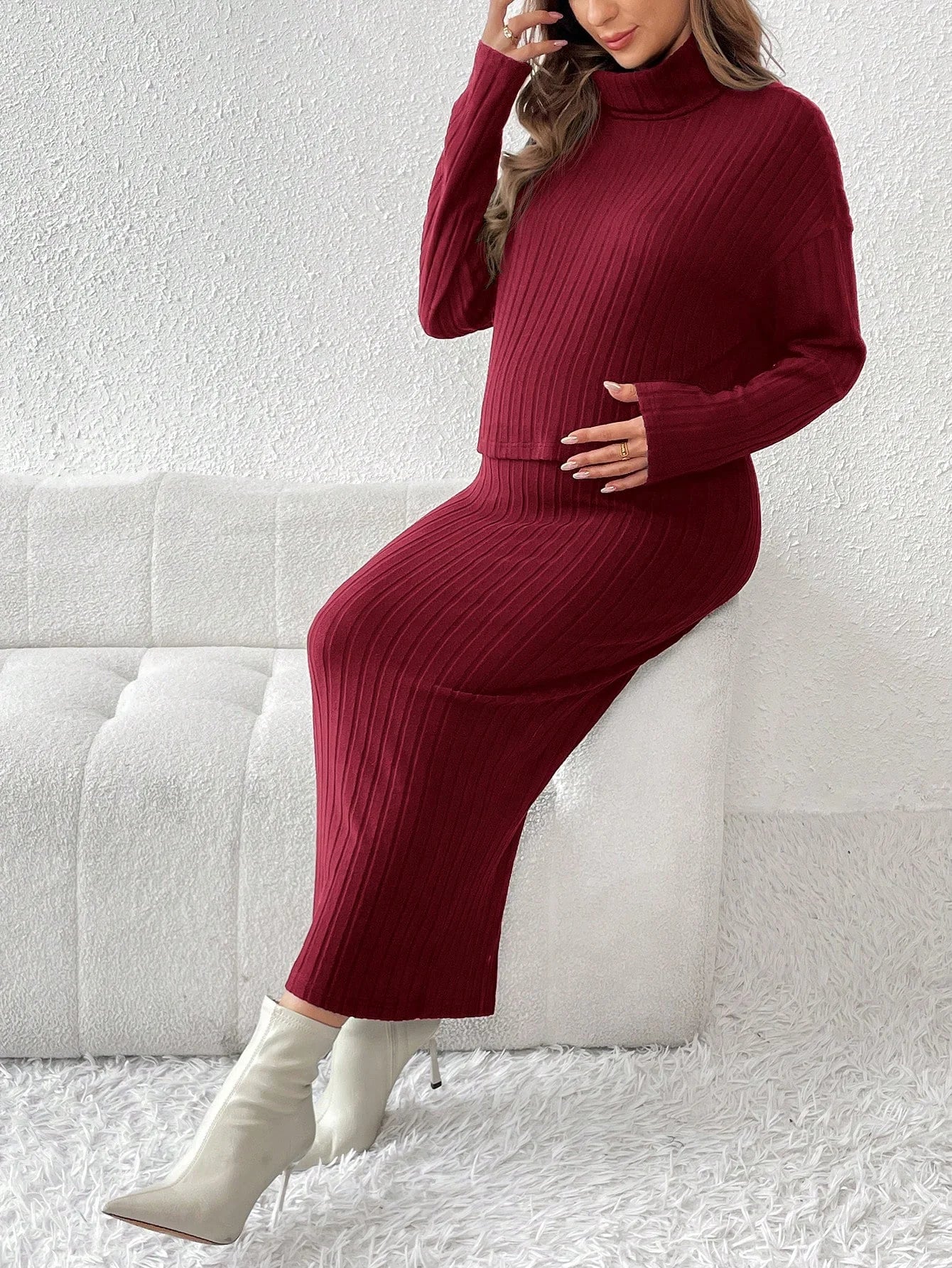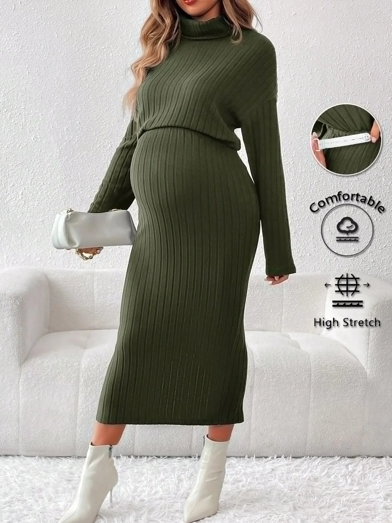 Un conjunto de dos piezas de suéter de cuello redondo de punto de color sólido y cintura alta para mujeres embarazadas
